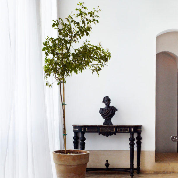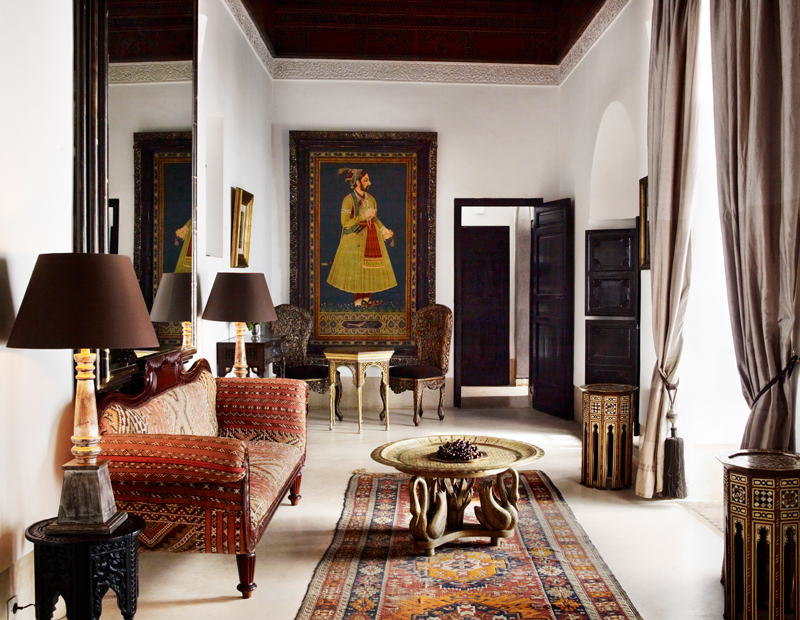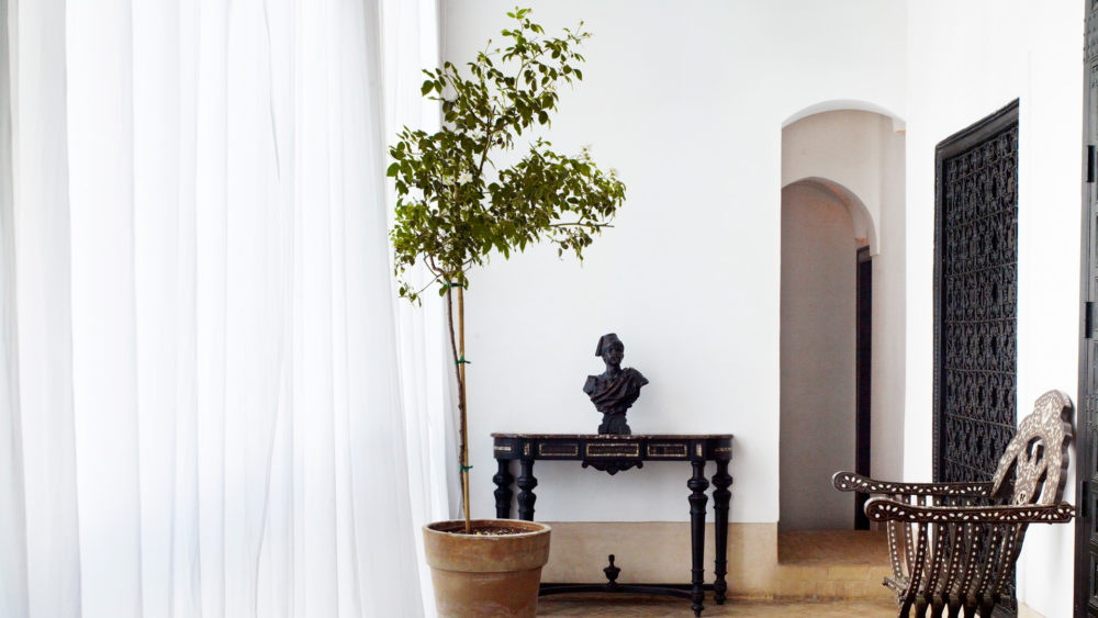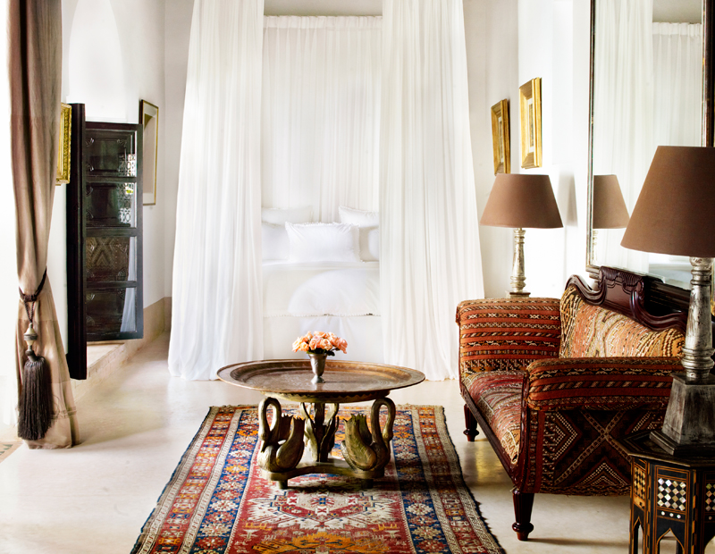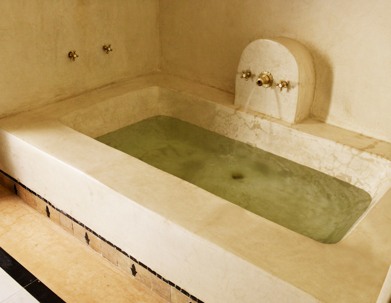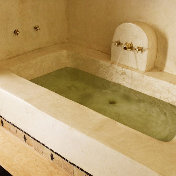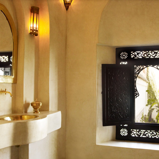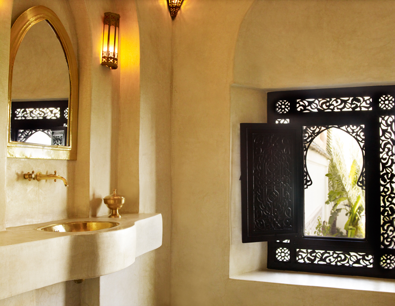 The Casablanca suite, opening out onto a private terrace, is on the first floor overlooking the courtyard garden. This authentically decorated suite boasts an impressive zouac ceiling, fine antique furniture, art and a king-size four-poster bed. A walk-through wardrobe leads to a spacious traditional tadelakt bathroom.