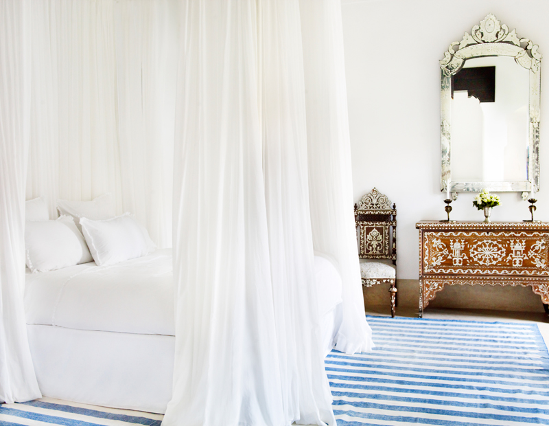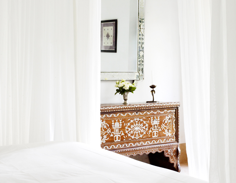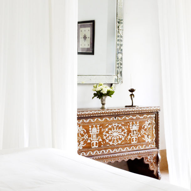 The Tangier suite is located on the first floor, its large windows open out onto the courtyard garden. This suite can be adjoined to the Fez suite forming a family suite of rooms. Traditional mother of pearl inlay furniture form part of the Tangier suite’s décor. A Moroccan lounge alcove offers a wonderful place to relax and unwind. The suite’s king-size four- poster bed is hung with white voile curtains. A walk through wardrobe leads to a tadelakt bathroom.